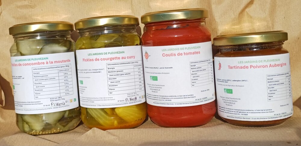 Nous vous proposons désormais nos nouvelles conserves maison : Pickles de concombre à la moutarde, Pickles de courgette au curry, Coulis de tomates et Tartinade poivron–aubergine.