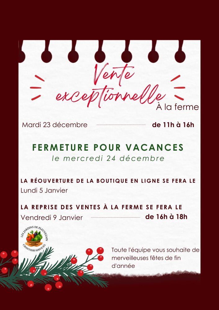 La vente à la ferme sera exceptionnellement ouverte le mardi 23 décembre de 11h à 16h et nos légumes seront aussi disponibles en retrait à Chantiers Services à Neufchateau le même jour de 13h à 17h !