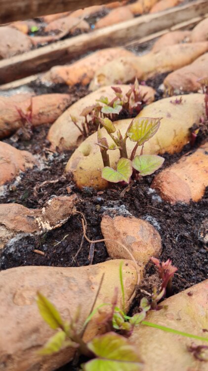 Ensuite, les Patates Douces ce sont les stars du réveil ! Regardez-moi ces germes. Elles sortent doucement de leur sieste hivernale et n'ont qu'une envie : aller plonger leurs racines dans la terre pour vous faire de belles réserves de douceur. 🍠✨