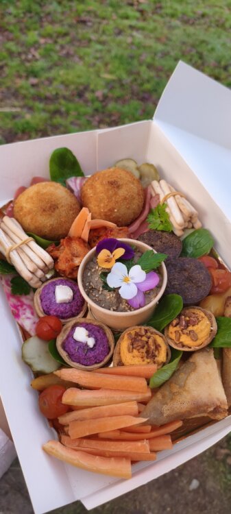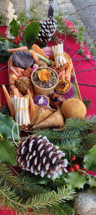 Des plateaux apéro à emporter avec les bouchées du moment : tapas chauds ou gourmandises froides (tartinables, crudités, pickles...)