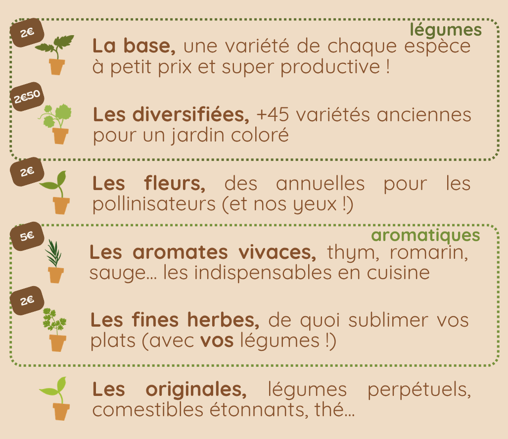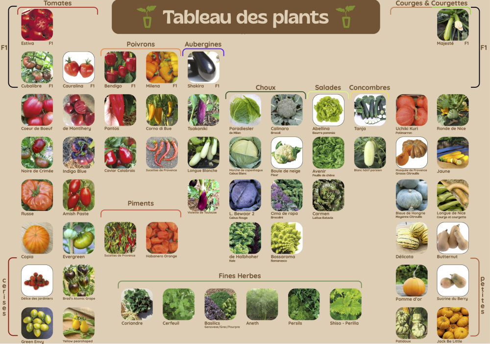 Nous avons fait le choix de proposer des variétés hybrides F1 et des variétés anciennes (dites population).