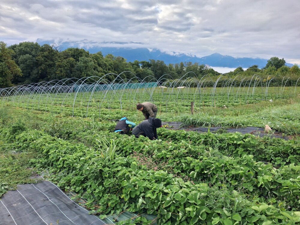 L'équipe des Vergers de Vernette s'active pour préparer les fraisiers plantés ce printemps à passer l'hiver : désherbage et coupe des stolons en cours pour que les plants gardent de l'énergie pour s'enraciner. Un travail fastidieux, néanmoins nécessaire pour récolter de belles fraises au printemps prochain ! Quelle satisfaction d'arriver au bout d'une ligne !!